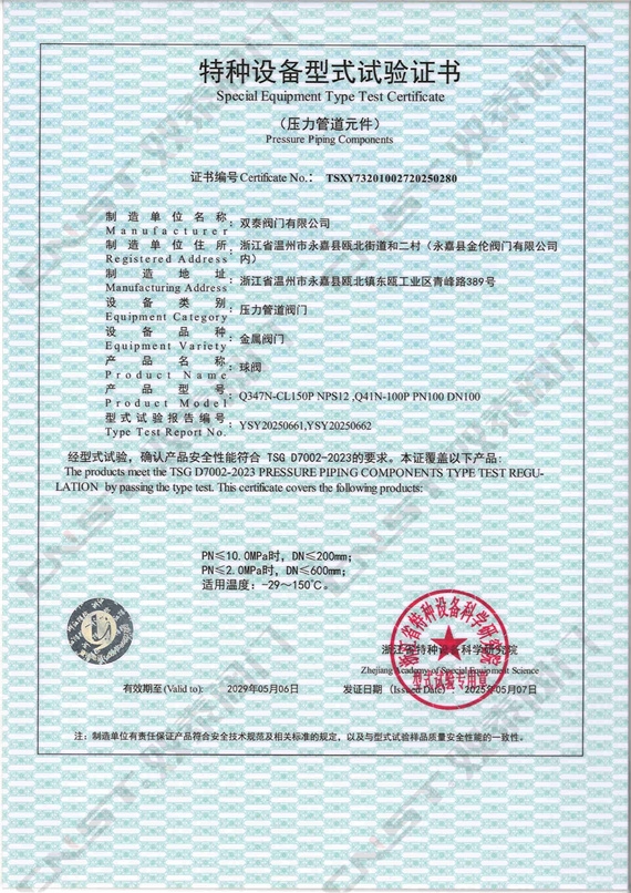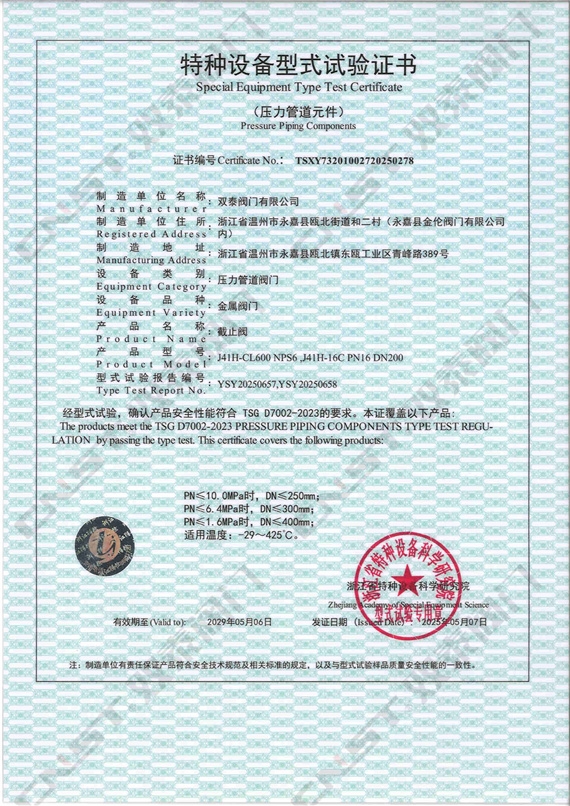 雙泰閥門自主研發生產的多種規格型號的蝶閥、球閥、閘閥、截止閥、止回閥等順利通過特種設備型式試驗,正式取得金屬閥門特種設備型式試驗證書。標志著雙泰閥門工廠秉承發展科技實力、嚴控產品質量、產品創新的精神,一如既往地獲得國家相關專業機構部門的認可。